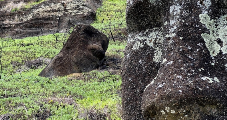 Un año después del devastador incendio que asoló parte de la recóndita Isla de Pascua y afectó a más de 200 moáis, las milenarias esculturas con forma de cabeza humana luchan contra la degradación y claman por fondos para ser restauradas.