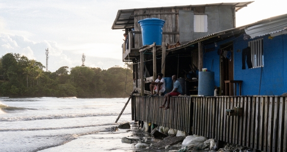 Pero desde mediados de 2024 el mar ha venido cobrando terreno con una ferocidad inusual. Las calles se desmoronan, las casas caen de noche y la playa parece retroceder a ojos vistos. Los números —esos que suelen parecer fríos— aquí tienen rostro: más de 3.000 familias afectadas, 22 casas ya perdidas y 39 dañadas, el muelle turístico fracturado, el acceso a los pueblos cada vez más precario. La Gobernación declaró calamidad pública. La comunidad cavó trincheras y alineó costales de arena. Aun así, el agua avanza.