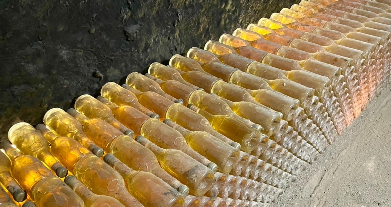 No lejos del terruño o parcelas donde se cultiva la vid están, en silencio y a oscuras, las bodegas subterráneas —el “santuario” lo llaman—. En ellas, en barricas primero —dos años— y en botellas después —un mínimo de dos o tres—, madura el vino a una temperatura de siete a ocho grados centígrados en la parte más profunda de los laberínticos túneles, pero nunca por encima de los doce grados, y con una humedad que oscila entre el 85 y el 95%.